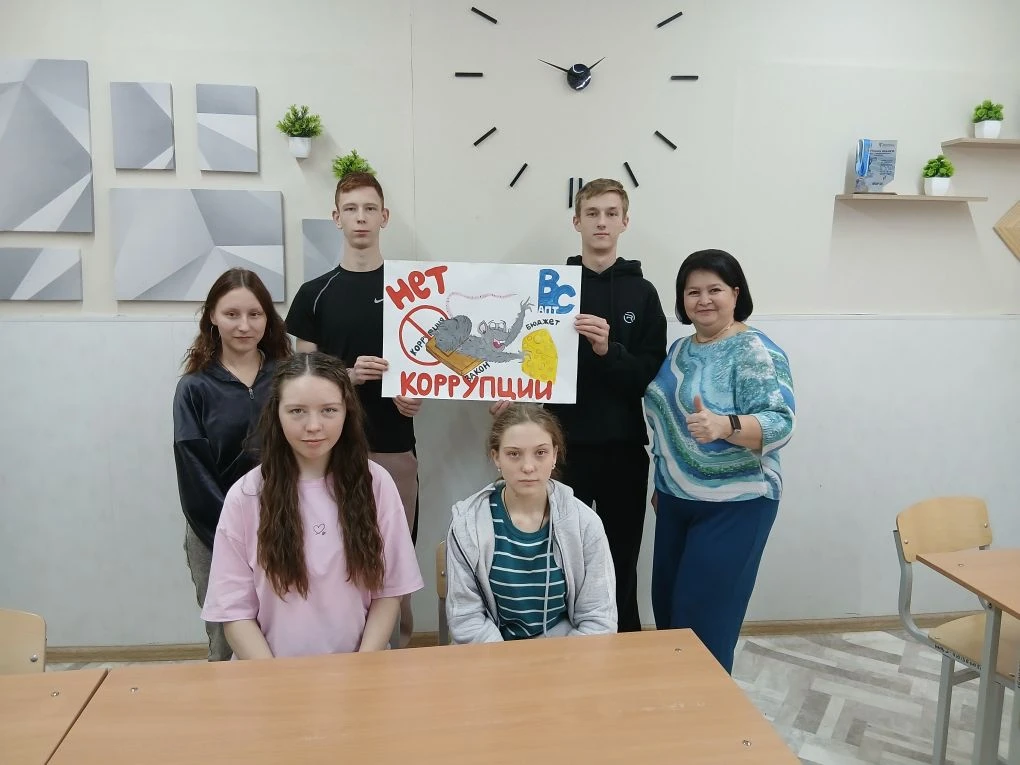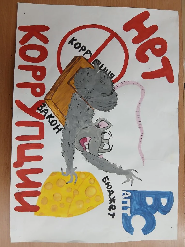 В рамках конкурса подготовили антикоррупционный плакат, который отражает тематику борьбы с коррупцией.Краткое описание идеи, заложенной в плакате — «Слепая кошка мышей не ловит» на тему коррупции. В нём мыши символизируют коррупционеров, а кошка — общество, простой народ.Кошка пристально наблюдает за мышами и в любой момент готова их поймать. Мыши могут строить себе шикарные дома, но это не скроет их от глаз кошки Преподаватель- Немтырева Галина Викторовна и обучающиеся Миронова Юлия; Иванов Роман; Бровин Алексей; Клейнова Александра; Исакова Виктория; Небараков Иван. Ответсвенный по профилактике коррупционных правонарушений -специалист по кадрам Хилютич Наталья Юрьевна .